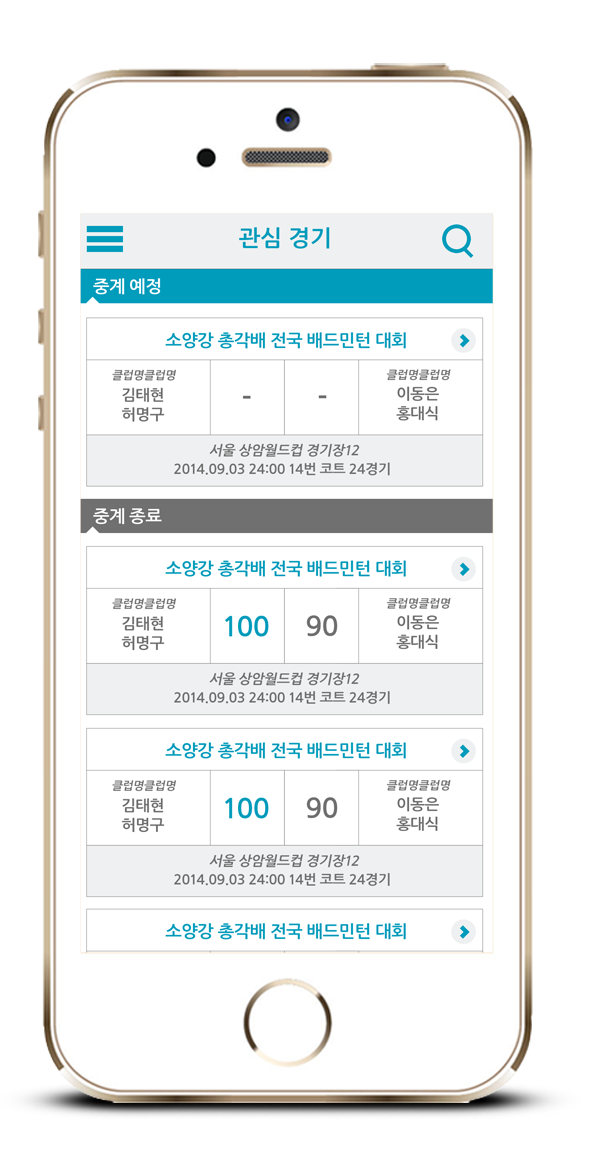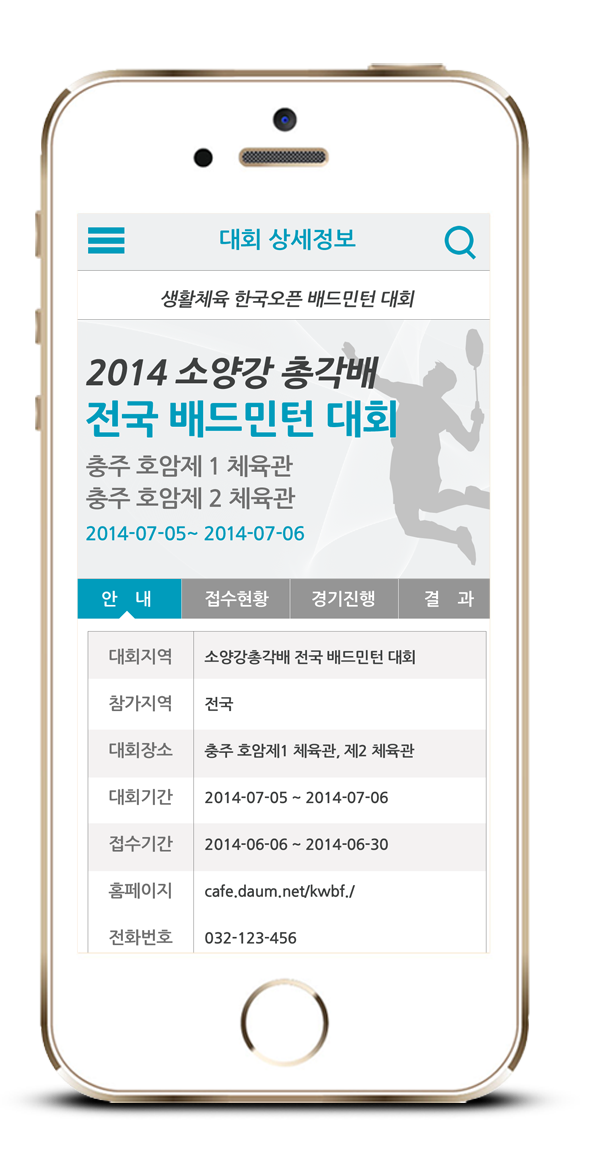 전국에서 펼쳐지는 배드민턴 대회의 상세안내, 접수현황, 대진결과, 경기결과 등 대회 참여자에게 보기쉽게 제공합니다.